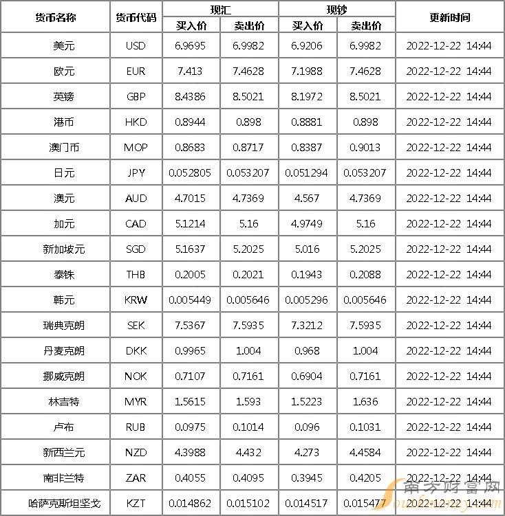 2022年12月22日银行间外汇市场人民币汇率中间价为:1美元对人民币6.9713元,1欧元对人民币7.3964元,100日元对人民币5.2684元,1港元对人民币0.89508元,1英镑对人民币8.4230元,1澳大利亚元对人民币4.6773元,1新西兰元对人民币4.3845元,1新加坡元对人民币5.1603元,1瑞士法郎对人民币7.5256元,1加拿大元对人民币5.1225元,人民币1元对0.63626马来西亚林吉特,人民币1元对10.1334俄罗斯卢布,人民币1元对2.4657南非兰特,人民币1元对183.59韩元,人民币1元对0.52683阿联酋迪拉姆,人民币1元对0.53951沙特里亚尔,人民币1元对54.3686匈牙利福林,人民币1元对0.62999波兰兹罗提,人民币1元对1.0057丹麦克朗,人民币1元对1.4943瑞典克朗,人民币1元对1.4106挪威克朗,人民币1元对2.67765土耳其里拉,人民币1元对2.8196墨西哥比索,人民币1元对4.9736泰铢。