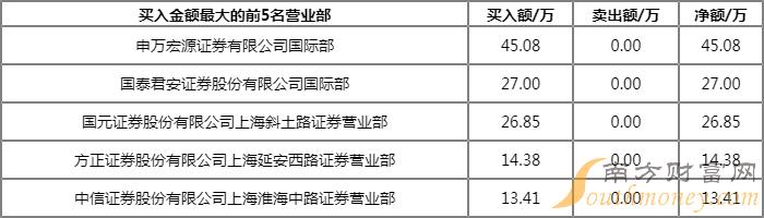 买一、卖一均为东亚前海证券上海分公司,该营业部买入2642.67万元,卖出2671.20万元,净买额为-28.52万元。近三个月内该席位共上榜94次,实力排名第41。