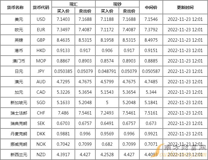 11月23日,人民币兑美元中间价报7.1281,上调386点;上一交易日中间价7.1667,上一交易日官网收盘价7.1384,上日夜盘报收7.1410。人民币16:30收盘价报7.1384,23:30夜盘收报7.1410。