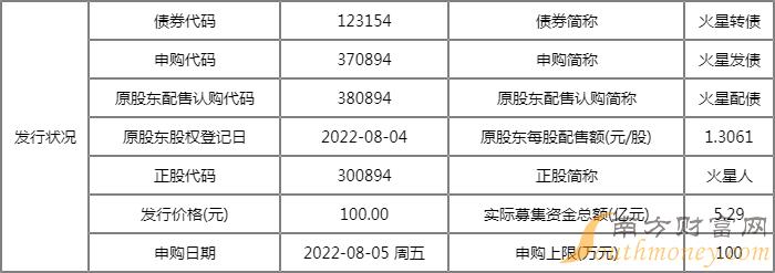 火星人8月2日晚间消息称,本次发行的可转债简称为“火星转债”,债券代码为“123154”。本次可转债的发行总额为人民币约29亿元,票面价格:本次发行的可转债每张面值为100元人民币,按面值发行。本次发行的可转债存续期限为发行之日起6年,即自2022年8月5日至2028年8月4日。