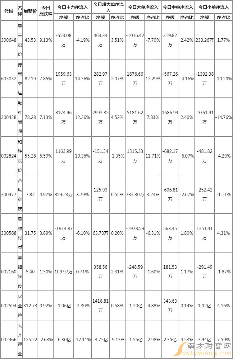 刀片电池主力净流出6.3783亿元