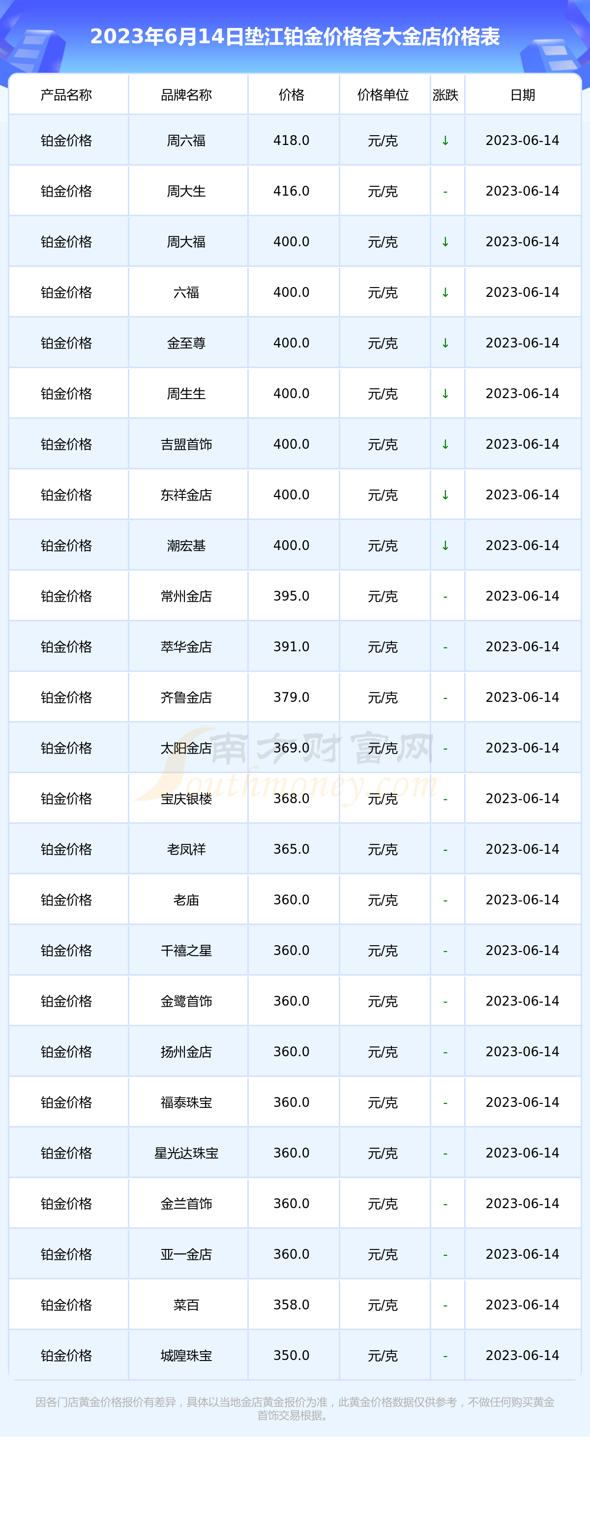 唐沙发 2023年6月14日,垫江周大福、老凤祥、周六福、六福、菜百、老庙、金至尊、周生生、千禧之星、吉盟首饰、金鹭首饰等各大金店品牌铂金价格今日价格如下:周大福400.0元/克、老凤祥365.0元/克、周六福418.0元/克、六福400.0元/克、菜百358.0元/克、老庙360.0元/克、金至尊400.0元/克、周生生400.0元/克、千禧之星360.0元/克、吉盟首饰400.0元/克、金鹭首饰360.0元/克。