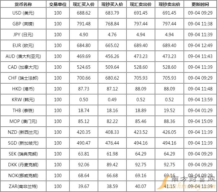 唐沙发 建设银行外汇牌价表9月4日 建设银行人民币对美元汇率多少? 下面同侃财君来看看。