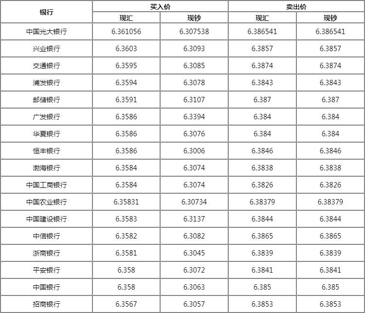 结汇最优:光大 汇率: 6.3610561000美元现汇可结汇为6361.06人民币
