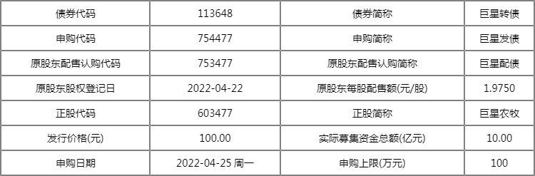 113648本次发行的可转换公司债券简称为“巨星转债”,债券代码为“113648”。发行总额:10亿元。发行数量:100万手。票面价格:100元/张。发行价格:按票面金额平价发行。本次发行的可转债期限为发行之日起6年。