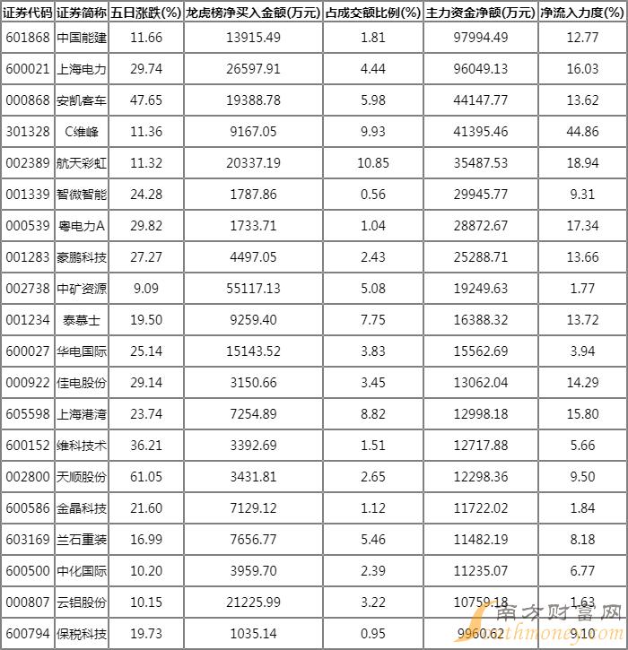 一些个股在龙虎榜的机构或营业部中显示出有资金在净买入,并且期间主力资金还在净流入,两方面都说明这些个股受到主力资金青睐。在近五日龙虎榜机构或营业部净买入的84只个股中,主力资金同期净流入的个股有61只,净流入金额最大的个股为中国能建、上海电力、安凯客车,主力资金分别为9.80亿元、9.60亿元、4.41亿元。主力资金净流入力度较大的个股有胜通能源、C维峰、博深股份,力度分别高达96.98%、44.86%、26.07%。