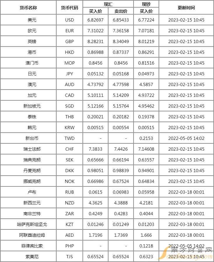 老眼昏花的梨子 最新2023年2月15日中国农业银行外汇牌价一览 农业银行人民币对美元汇率多少?下面同道财君来看看。