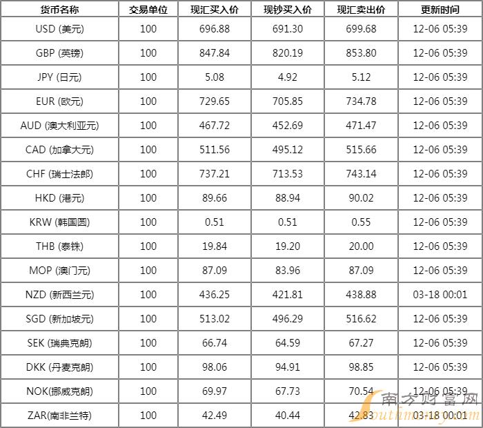 脸色苍白的贵 中国农业银行外汇牌价表 12月6日农行人民币汇率多少?下面同大脸怪来看看。