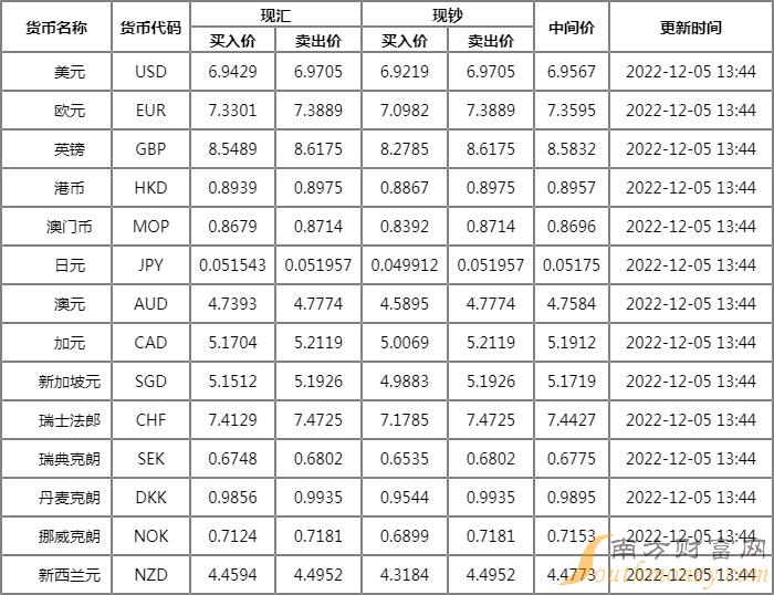 12月5日,2022年12月5日银行间外汇市场人民币汇率中间价为:1美元对人民币7.0384元,前一交易日中间价报7.0542元,单日调升158基点。