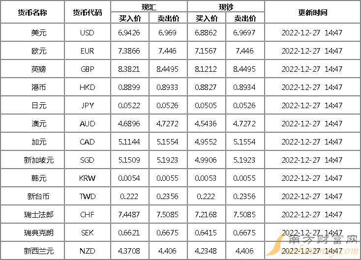 2022年12月27日银行间外汇市场人民币汇率中间价为:1美元对人民币6.9546元,1欧元对人民币7.4007元,100日元对人民币5.2391元,1港元对人民币0.89139元,1英镑对人民币8.4003元,1澳大利亚元对人民币4.6902元,1新西兰元对人民币4.3831元,1新加坡元对人民币5.1618元,1瑞士法郎对人民币7.4621元,1加拿大元对人民币5.1273元,人民币1元对0.63571马来西亚林吉特,人民币1元对9.8558俄罗斯卢布,人民币1元对2.4501南非兰特,人民币1元对183.18韩元,人民币1元对0.52806阿联酋迪拉姆,人民币1元对0.54074沙特里亚尔,人民币1元对54.0658匈牙利福林,人民币1元对0.62721波兰兹罗提,人民币1元对1.0050丹麦克朗,人民币1元对1.5091瑞典克朗,人民币1元对1.4141挪威克朗,人民币1元对2.68532土耳其里拉,人民币1元对2.7850墨西哥比索,人民币1元对4.9818泰铢。