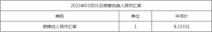 英镑兑人民币今日汇率3月1日一览 人民币对英镑又是多少?小红帽提供兑换汇率,仅供参考。