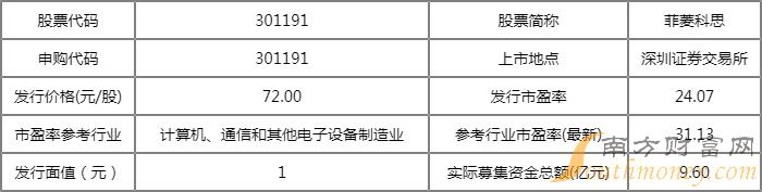 据交易所消息,菲菱科思今日申购,申购代码:301191,发行价格:72元/股,单一账户申购上限13,000股,顶格申购需配市值13万元。
