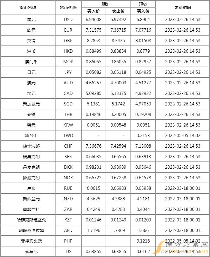 盖黛 周末中国农业银行外汇牌价表,2月26日农业银行人民币汇率多少?下面同大眼君整理