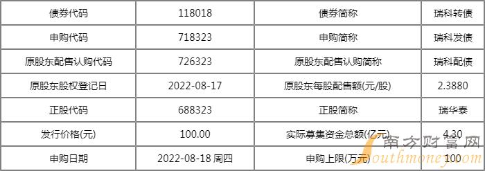 瑞华泰(688323)消息,公司将发行4.3亿元可转换公司债券(“可转债”),债券简称为“瑞科转债”,债券代码“118018”,转股价格为30.98元,申购日期为2022年8月18日,网上申购时间为T日9:30-11:30,13:00-15:00。