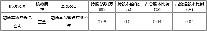 根据2022Q1季报公募基金重仓股数据,重仓该股的公募基金共4家,其中持有数量最多的公募基金为融通鑫新成长混合A。融通鑫新成长混合A目前规模为 0.41亿元 (截止至:2022-06-30)。