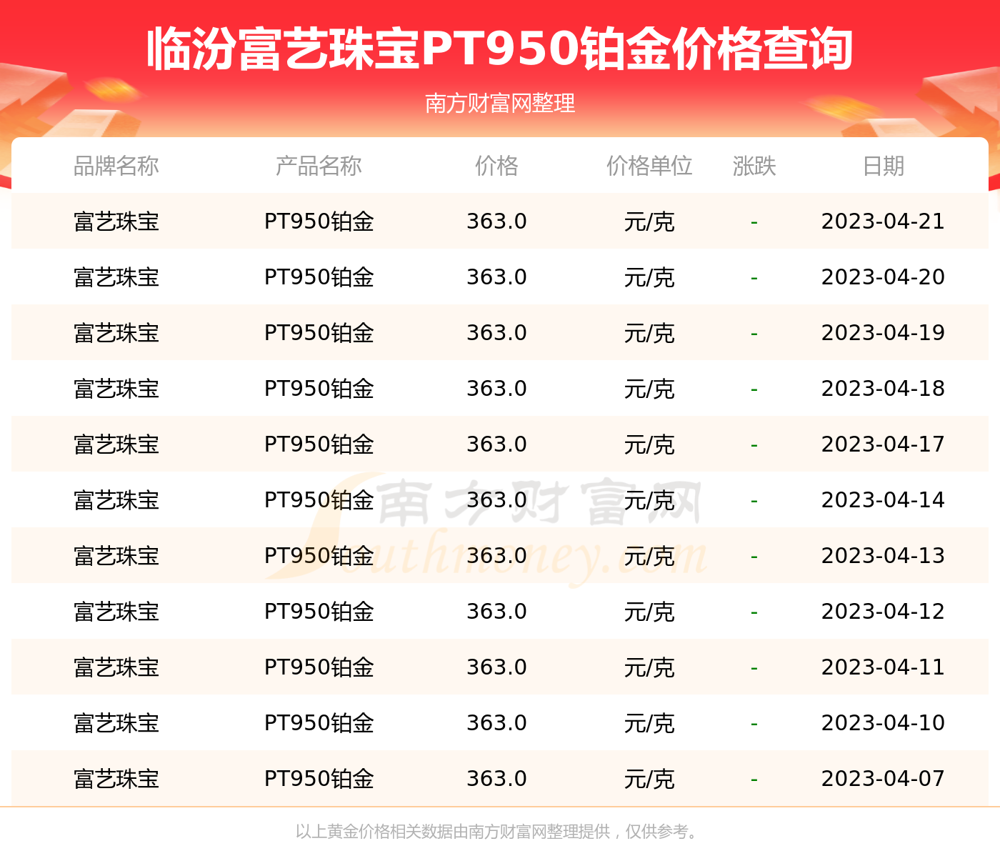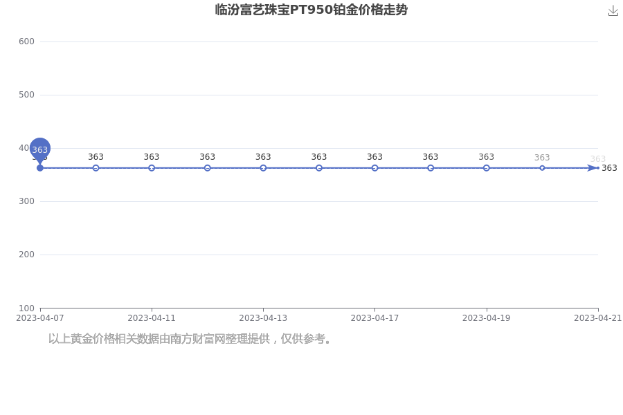 2023年4月18日富艺珠宝今日价格:黄金价格579.0元/克,PT950铂金363.0元/克,PT990铂金383.0元/克,投资金条557.0元/克。