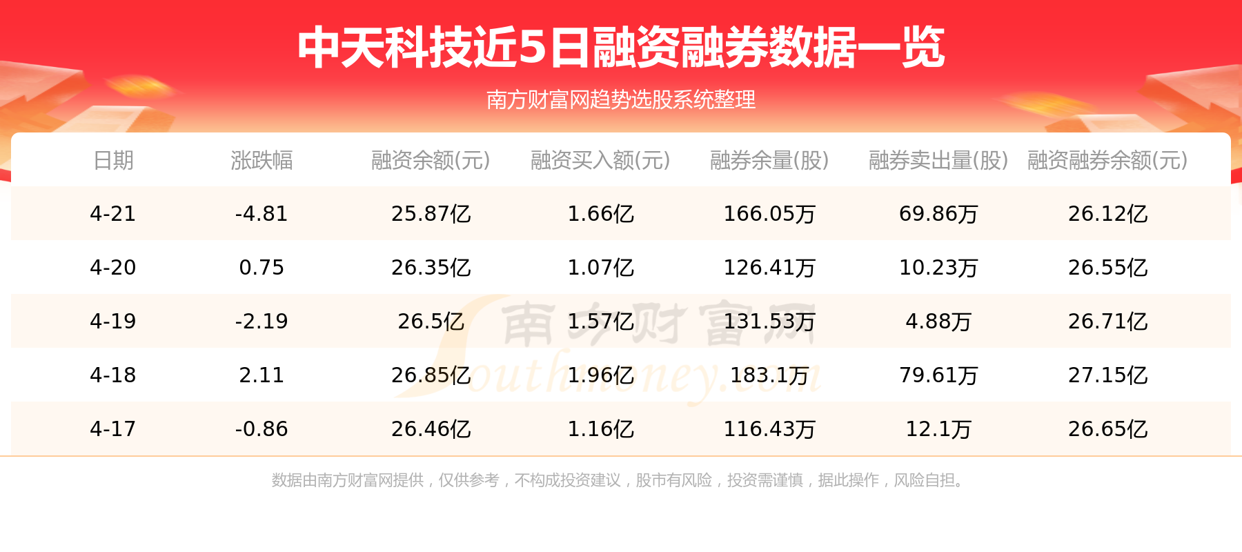 中天科技4月21日融券信息显示,融资方面,当日融资买入1.66亿元,融资偿还2.14亿元,融资净买额-4795.74万元。融券方面,融券卖出69.86万股,融券偿还30.22万股,融券余量166.05万股,融券余额2560.49万元。融资融券余额26.12亿元。近5日融资融券数据一览见下表:
