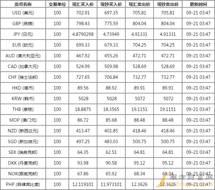 喻慧 浦发银行外汇牌价表 9月21日浦发银行人民币对美元汇率多少?下面同大咖君来看看。