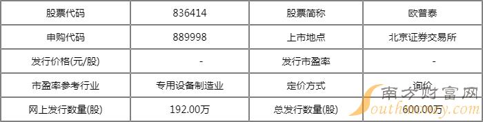 欧普泰(836414)即将进入发行程序,公司将于11月23日、11月24日进行询价,11月29日申购,发行代码为“889998”。战投方面,南方基金、景顺长城基金、晨鸣资管等10家战投共拟认购3600万元。