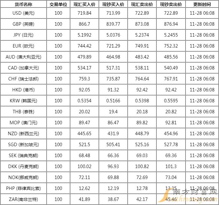 两目如锥的萝卜 中国银行外汇牌价表一览 11月28日中行人民币汇率多少?下面同微聊君来看看。