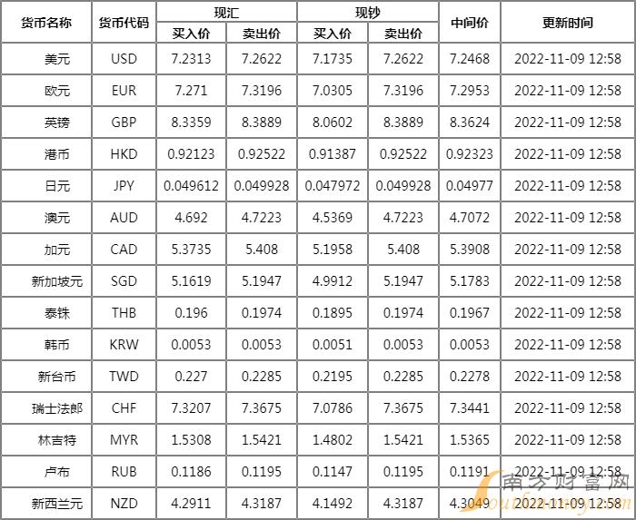 2022年11月10日银行间外汇市场人民币汇率中间价为:1美元对人民币7.2422元,1欧元对人民币7.2523元,100日元对人民币4.9450元,1港元对人民币0.92261元,1英镑对人民币8.2302元,1澳大利亚元对人民币4.6531元,1新西兰元对人民币4.2615元,1新加坡元对人民币5.1631元,1瑞士法郎对人民币7.3605元,1加拿大元对人民币5.3525元,人民币1元对0.65006马来西亚林吉特,人民币1元对8.4254俄罗斯卢布,人民币1元对2.4540南非兰特,人民币1元对188.80韩元,人民币1元对0.50760阿联酋迪拉姆,人民币1元对0.51974沙特里亚尔,人民币1元对55.5717匈牙利福林,人民币1元对0.65090波兰兹罗提,人民币1元对1.0263丹麦克朗,人民币1元对1.5036瑞典克朗,人民币1元对1.4334挪威克朗,人民币1元对2.57078土耳其里拉,人民币1元对2.7096墨西哥比索,人民币1元对5.0898泰铢。
