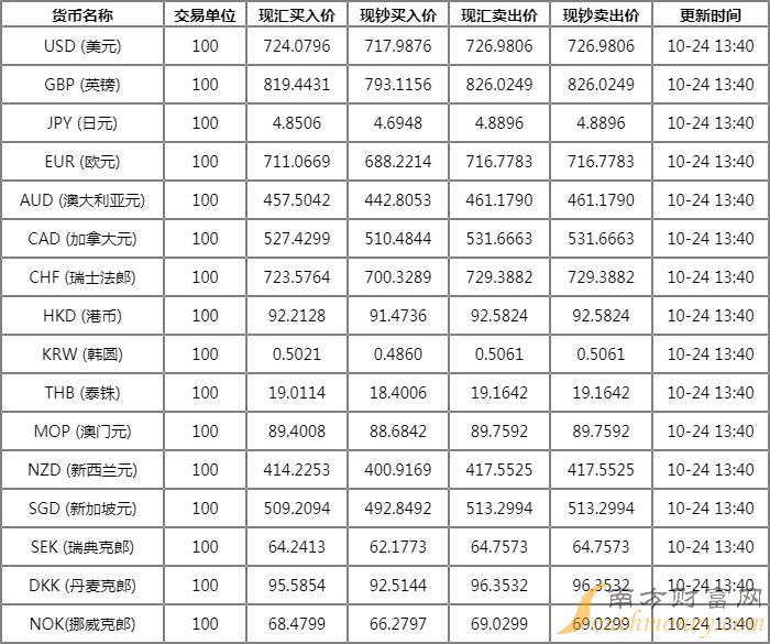 2022年10月13日银行间外汇市场人民币汇率中间价为1美元对人民币7.1101元,1欧元对人民币6.9199元,100日元对人民币4.8585元,1港元对人民币0.90585元,1英镑对人民币7.9113元,1澳大利亚元对人民币4.4729元,1新西兰元对人民币3.9998元,1新加坡元对人民币4.9704元,1瑞士法郎对人民币7.1519元,1加拿大元对人民币5.1602元,人民币1元对0.65770林吉特,人民币1元对9.0801俄罗斯卢布,人民币1元对2.5656南非兰特,人民币1元对199.55韩元,人民币1元对0.51562阿联酋迪拉姆,人民币1元对0.52756沙特里亚尔,人民币1元对62.5470匈牙利福林,人民币1元对0.70133波兰兹罗提,人民币1元对1.0772丹麦克朗,人民币1元对1.5911瑞典克朗,人民币1元对1.5126挪威克朗,人民币1元对2.60174土耳其里拉,人民币1元对2.8105墨西哥比索,人民币1元对5.3116泰铢。