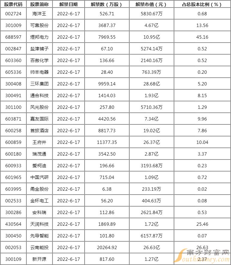 6月17日(下个交易日)限售股解禁一览: