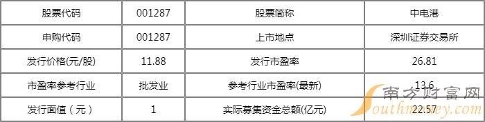 中电港今日开启申购,公司此次发行总数为18998万股,其中网上发行5699万股,申购代码001287,申购价格11.88元 ,发行市盈率为26.81倍,单一账户申购上限为5.65万股,申购数量为500股的整数倍。