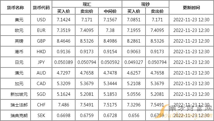 11月23日,人民币兑美元中间价报7.1281,上调386点;上一交易日中间价7.1667,上一交易日官网收盘价7.1384,上日夜盘报收7.1410。人民币16:30收盘价报7.1384,23:30夜盘收报7.1410。