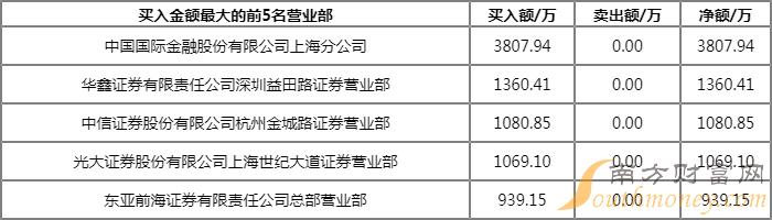 上榜的前五大买卖营业部合计成交1.40亿元, 其中,买入成交额为8257.46万元,卖出成交额为5736.92万元,合计净买入2520.54万元。具体来看,今日上榜营业部中,第一大买入营业部为中国国际金融股份有限公司上海分公司,买入金额为3807.94万元,其次是华鑫证券有限责任公司深圳益田路证券营业部,买入金额1360.41万元。卖出营业部中,卖出金额居首的是招商证券股份有限公司武汉青年路证券营业部,卖出金额为1549.36万元。