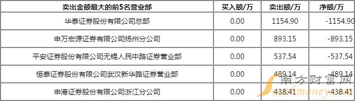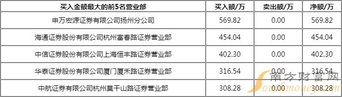 上榜的前五大买卖营业部合计成交5564.13万元, 其中,买入成交额为2050.98万元,卖出成交额为3513.15万元,合计净卖出1462.17万元。具体来看,今日上榜营业部中,第一大买入营业部为申万宏源证券有限公司扬州分公司,买入金额为569.82万元,其次是海通证券股份有限公司杭州富春路证券营业部,买入金额454.04万元。卖出营业部中,卖出金额居首的是华泰证券股份有限公司总部,卖出金额为1154.90万元。