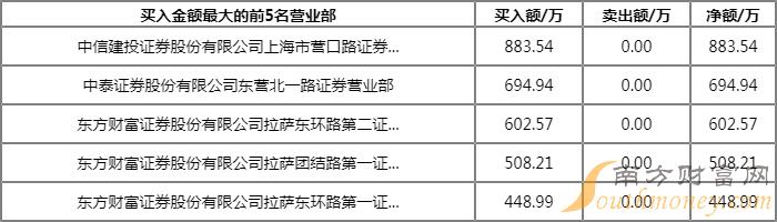 买五为东方财富证券拉萨东环路第一证券营业部,该席位买入274.00万元,卖出125.05万元,净买额为148.95万元。近三个月内该席位共上榜1328次,实力排名第4。