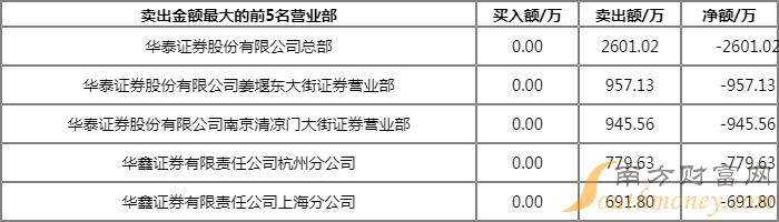 上榜的前五大买卖营业部合计成交9113.41万元,其中,买入成交额为3138.26万元,卖出成交额为5975.15万元,合计净卖出2836.89万元。