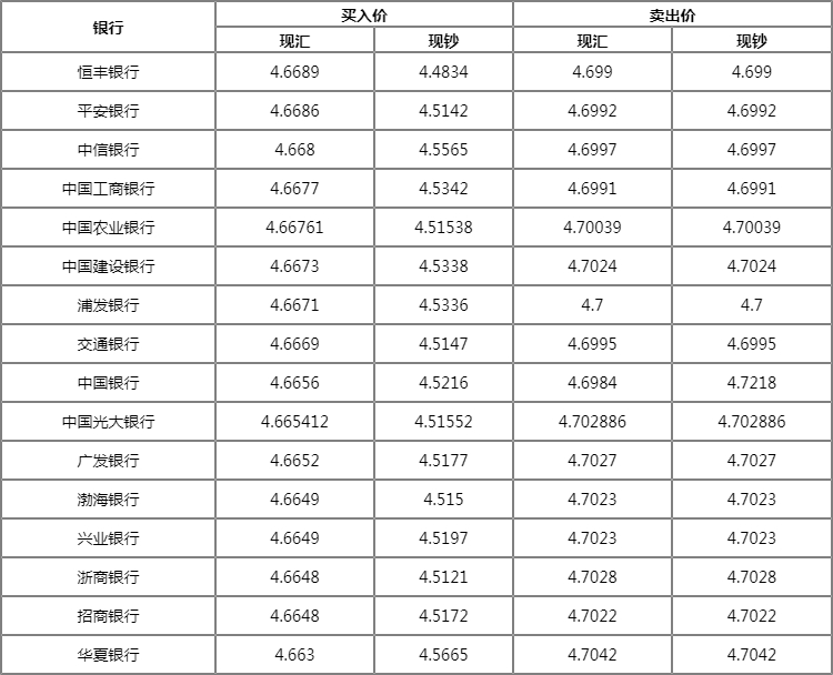 结汇最优:恒丰 汇率: 4.66891000新加坡元现汇可结汇为4668.90人民币
