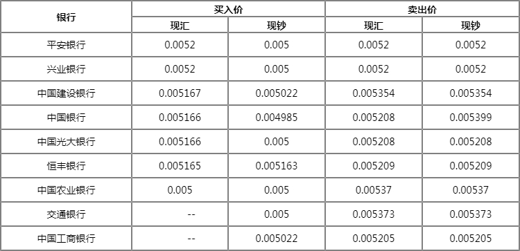 结汇最优:平安, 兴业 汇率: 0.00521000韩国元现汇可结汇为5.20人民币