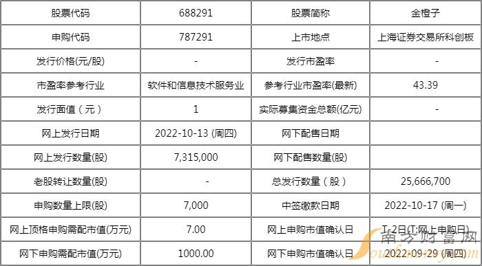 10月13日发行,金橙子发行价还未出炉,参考行业市盈率(最新)43.39。