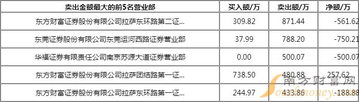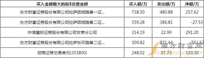 今日上榜营业部中,第一大买入营业部为东方财富证券股份有限公司拉萨团结路第一证券营业部,买入金额为738.50万元,第一大卖出营业部为东方财富证券股份有限公司拉萨东环路第二证券营业部,卖出金额为871.44万元。