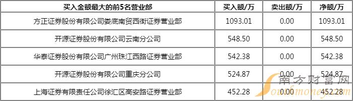 上榜的前五大买卖营业部合计成交3836.41万元, 其中,买入成交额为3161.03万元,卖出成交额为675.38万元,合计净买入2485.65万元。具体来看,今日上榜营业部中,第一大买入营业部为方正证券股份有限公司娄底南贸西街证券营业部,买入金额为1093.01万元,其次是开源证券股份有限公司云南分公司,买入金额548.50万元。卖出营业部中,卖出金额居首的是财信证券股份有限公司哈尔滨爱建路证券营业部,卖出金额为197.01万元。