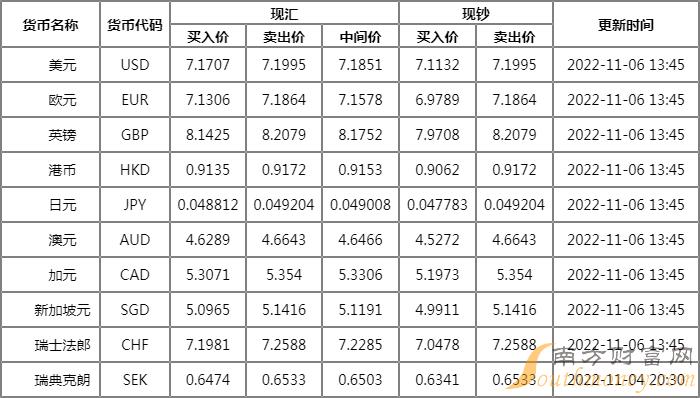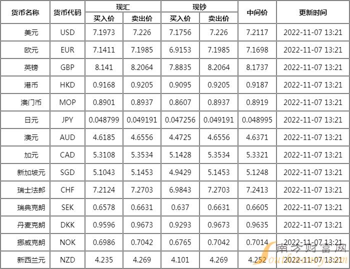 2022年11月4日人民币兑美元汇率中间价报7.2555,较前一交易日下调83个基点。前一交易日中间价报7.2472,人民币16:30收盘价报7.3200,23:30夜盘收报7.3000。