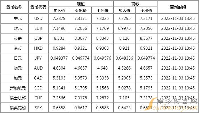 11月3日,人民币兑美元中间价报7.2472,下调275点;上一交易日中间价7.2197,上一交易日官网收盘价7.2825,上日夜盘报收7.2890。