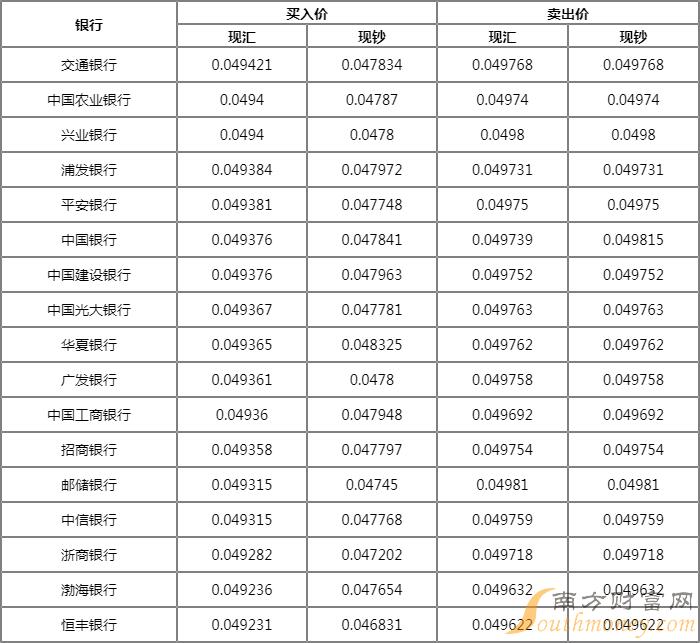 1美元对人民币6.6863元,1欧元对人民币7.0067元,100日元对人民币4.9239元,1港元对人民币0.85208元,1英镑对人民币8.1321元,1澳大利亚元对人民币4.6138元,1新西兰元对人民币4.1722元,1新加坡元对人民币4.8119元,1瑞士法郎对人民币7.0016元,1加拿大元对人民币5.1949元,人民币1元对0.65877马来西亚林吉特,人民币1元对8.1538俄罗斯卢布,人民币1元对2.4362南非兰特,人民币1元对192.72韩元,人民币1元对0.54908阿联酋迪拉姆,人民币1元对0.56093沙特里亚尔,人民币1元对56.5751匈牙利福林,人民币1元对0.67044波兰兹罗提,人民币1元对1.0613丹麦克朗,人民币1元对1.5304瑞典克朗,人民币1元对1.4724挪威克朗,人民币1元对2.49599土耳其里拉,人民币1元对3.0071墨西哥比索,人民币1元对5.2791泰铢。