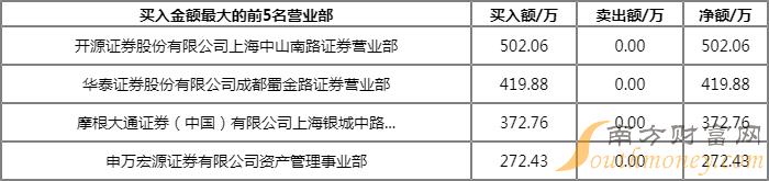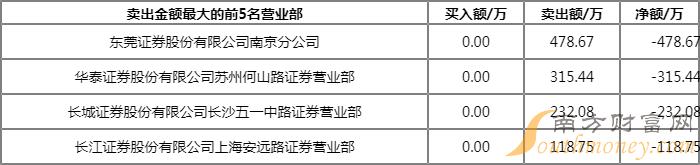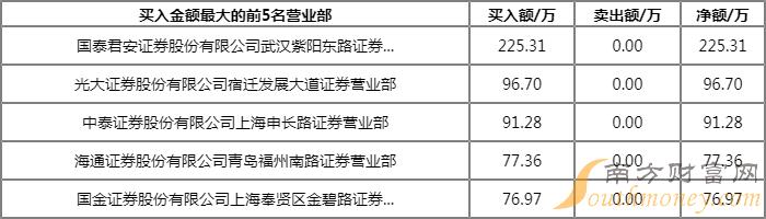 今日上榜营业部中,第一大买入营业部为国泰君安证券股份有限公司武汉紫阳东路证券营业部,买入金额为225.31万元,第一大卖出营业部为东莞证券股份有限公司南京分公司,卖出金额为478.67万元。