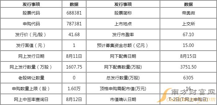 帝奥微将于8月11日进行申购,股票代码688381,申购代码787381,网上发行1608万股,发行价格41.68元/股,发行市盈率:67.10。