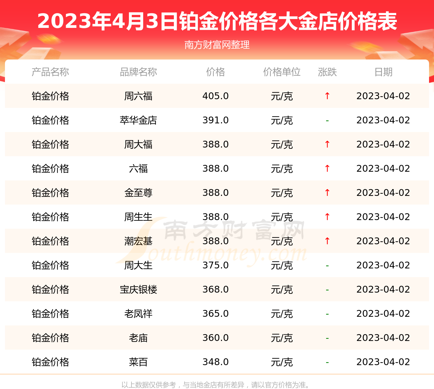 嘴巴橛着的橡皮擦 2023年4月3日,周大福、老凤祥、周六福、六福、菜百、老庙、金至尊、周生生、潮宏基、周大生、宝庆银楼等各大金店品牌铂金价格今日价格如下:周大福388.0元/克、老凤祥365.0元/克、周六福405.0元/克、六福388.0元/克、菜百348.0元/克、老庙360.0元/克、金至尊388.0元/克、周生生388.0元/克、潮宏基388.0元/克、周大生375.0元/克、宝庆银楼368.0元/克。