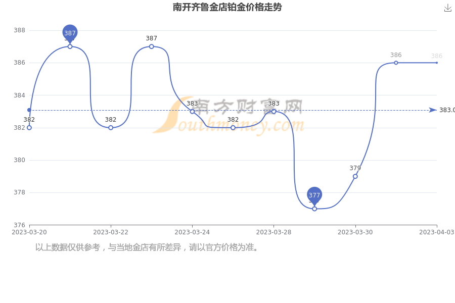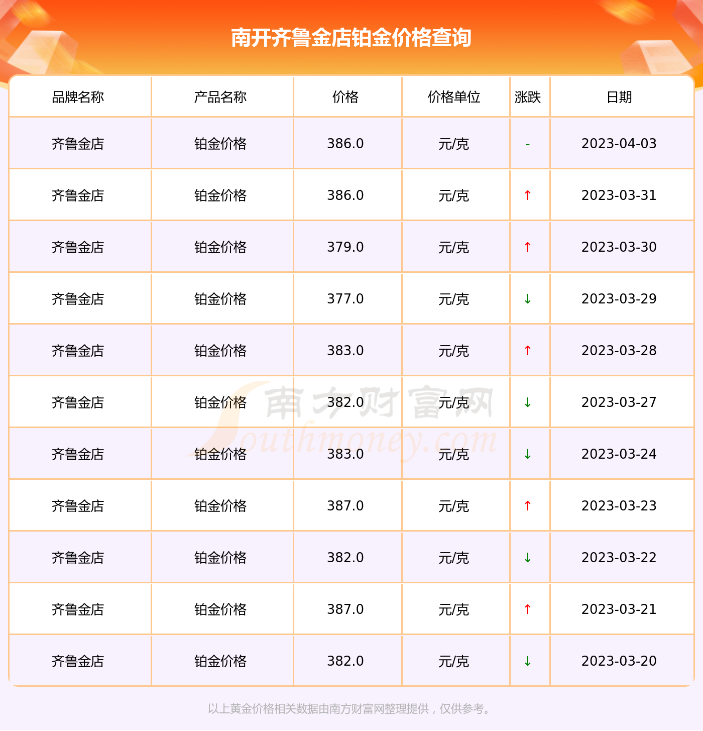 2023年4月3日南开齐鲁金店铂金价格为386.0元/克。