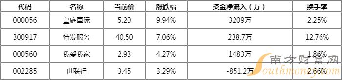 板块个股中,涨幅最大的前5个股为:皇庭国际报5.20元,涨9.94%;特发服务报39.58元,涨4.63%;世联行报3.47元,涨3.89%;我爱我家报2.90元,涨3.20%;ST巴士报5.49元,涨2.04%。