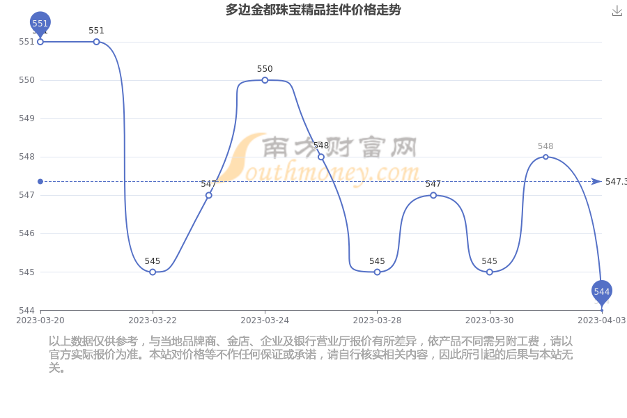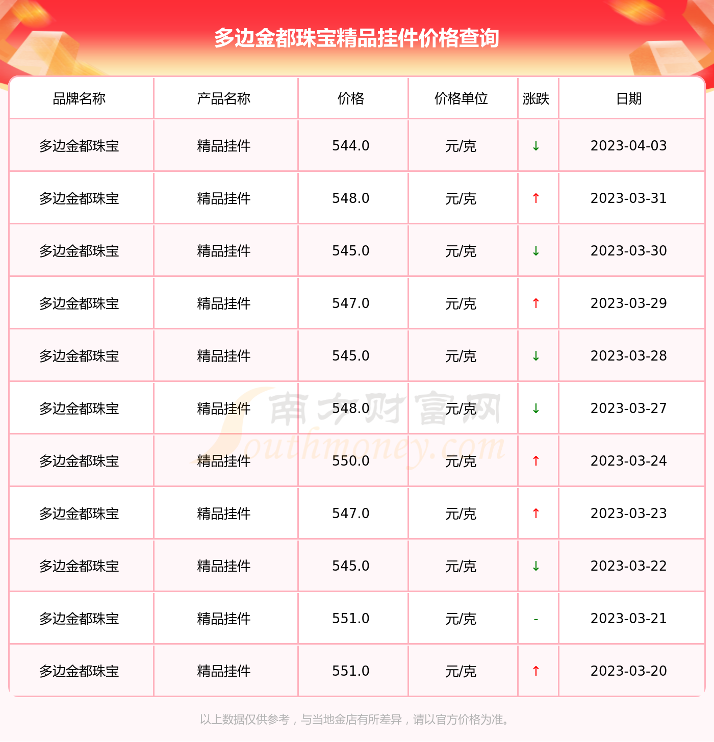 2023年4月4日多边金都珠宝精品挂件价格:544.0元/克。