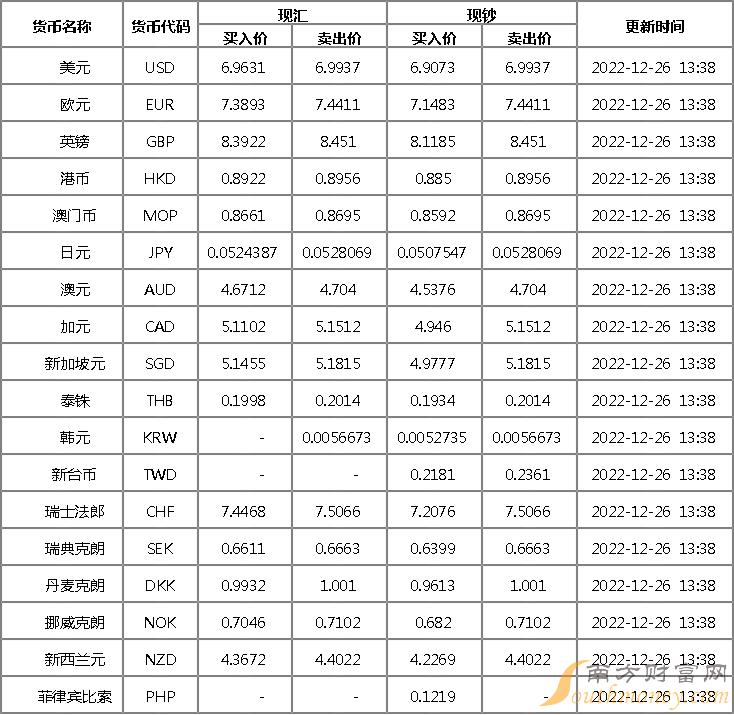 2022年12月22日银行间外汇市场人民币汇率中间价为:1美元对人民币6.9713元,1欧元对人民币7.3964元,100日元对人民币5.2684元,1港元对人民币0.89508元,1英镑对人民币8.4230元,1澳大利亚元对人民币4.6773元,1新西兰元对人民币4.3845元,1新加坡元对人民币5.1603元,1瑞士法郎对人民币7.5256元,1加拿大元对人民币5.1225元,人民币1元对0.63626马来西亚林吉特,人民币1元对10.1334俄罗斯卢布,人民币1元对2.4657南非兰特,人民币1元对183.59韩元,人民币1元对0.52683阿联酋迪拉姆,人民币1元对0.53951沙特里亚尔,人民币1元对54.3686匈牙利福林,人民币1元对0.62999波兰兹罗提,人民币1元对1.0057丹麦克朗,人民币1元对1.4943瑞典克朗,人民币1元对1.4106挪威克朗,人民币1元对2.67765土耳其里拉,人民币1元对2.8196墨西哥比索,人民币1元对4.9736泰铢。
