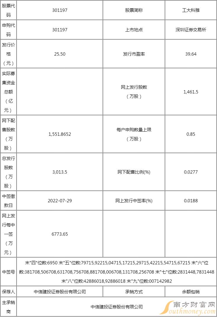 雪白细牙的围巾 工大科雅中签号查询方法 301197工大科雅中签号公布了吗?工大科雅(301197)上市时间表 中签号查询 接下来跟小宋一起来看看相关资讯。