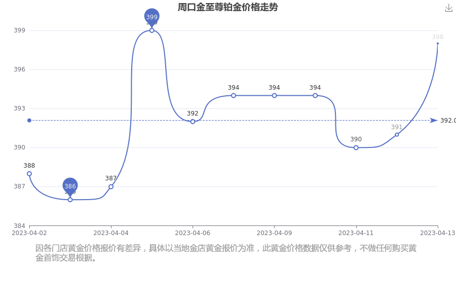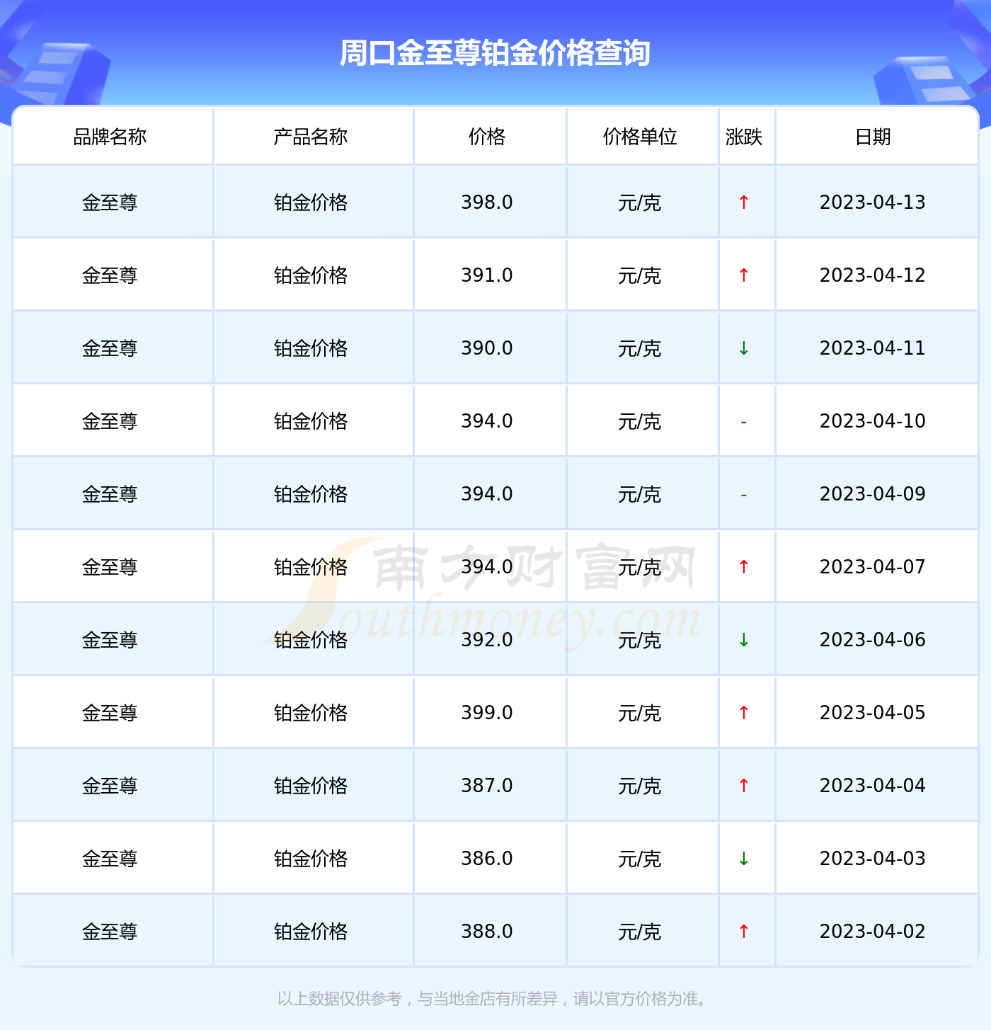 今日(2023年4月13日)周口金至尊铂金价格是398.0元/克。